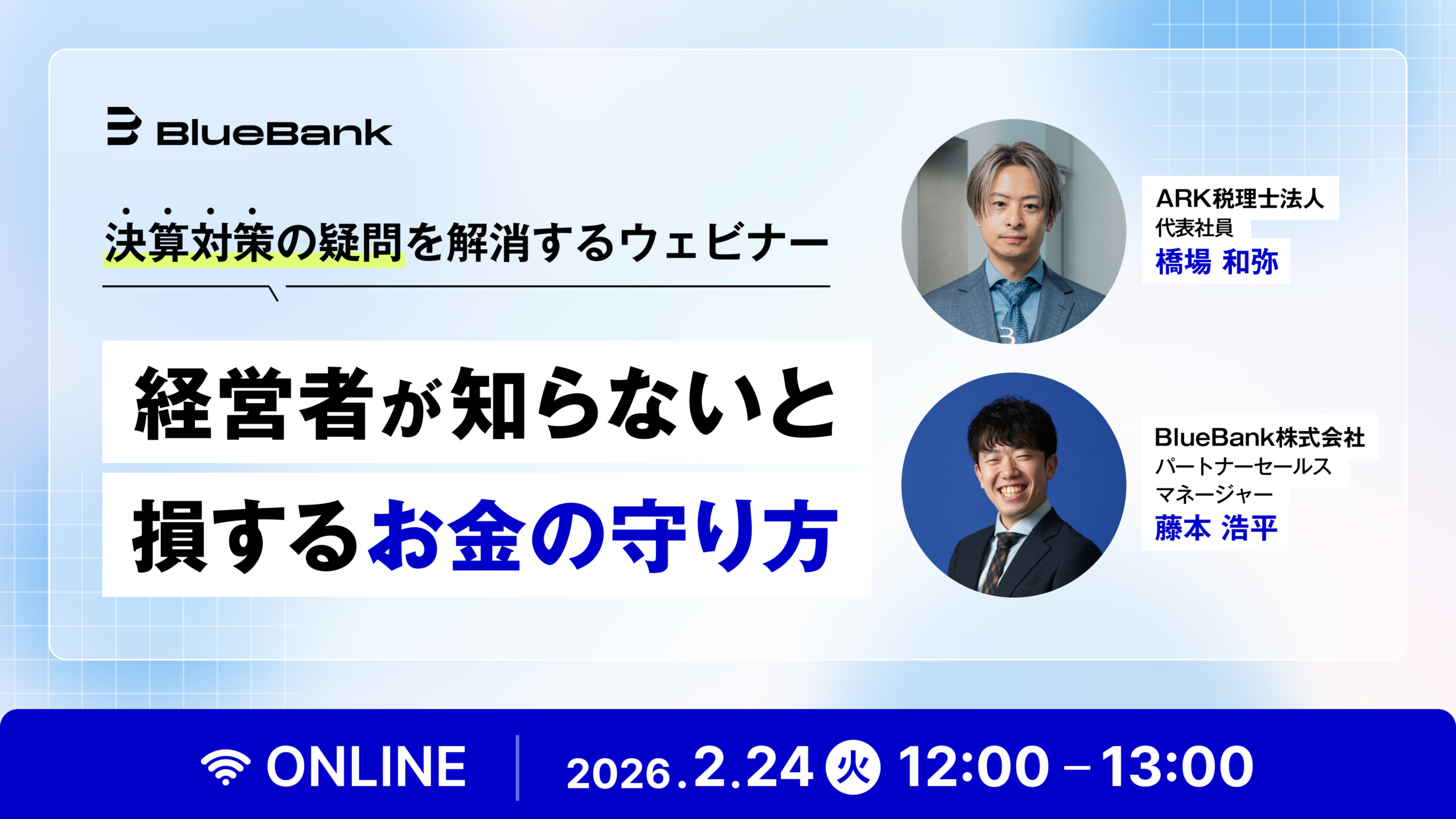 BlueBankは経営者支援を強みとして急成長を続けているARK税理士法人(本社:東京都中央区、代表:橋場和弥)と共同で、2026年2月24日(火)にオンラインセミナーを開催いたします。